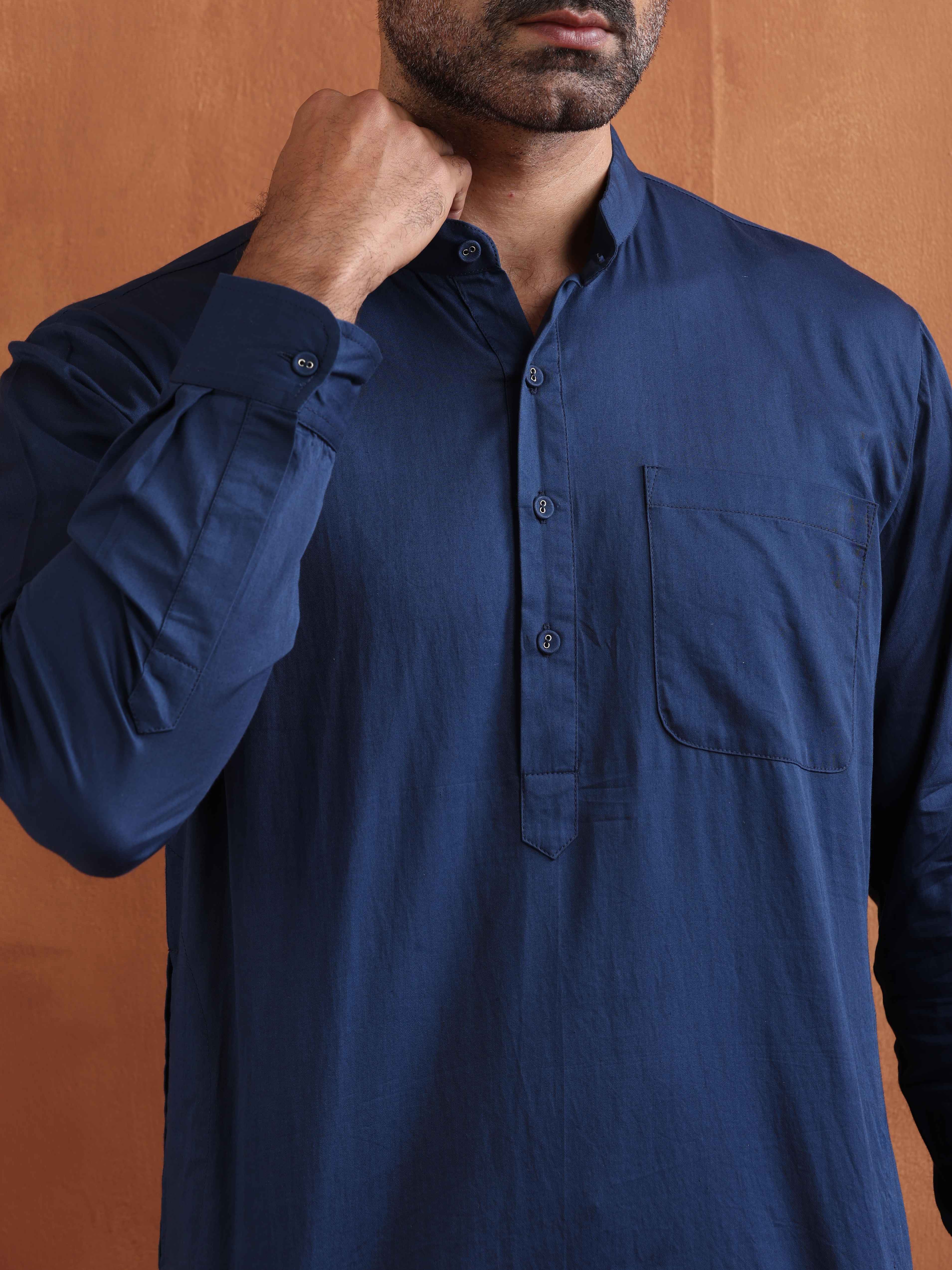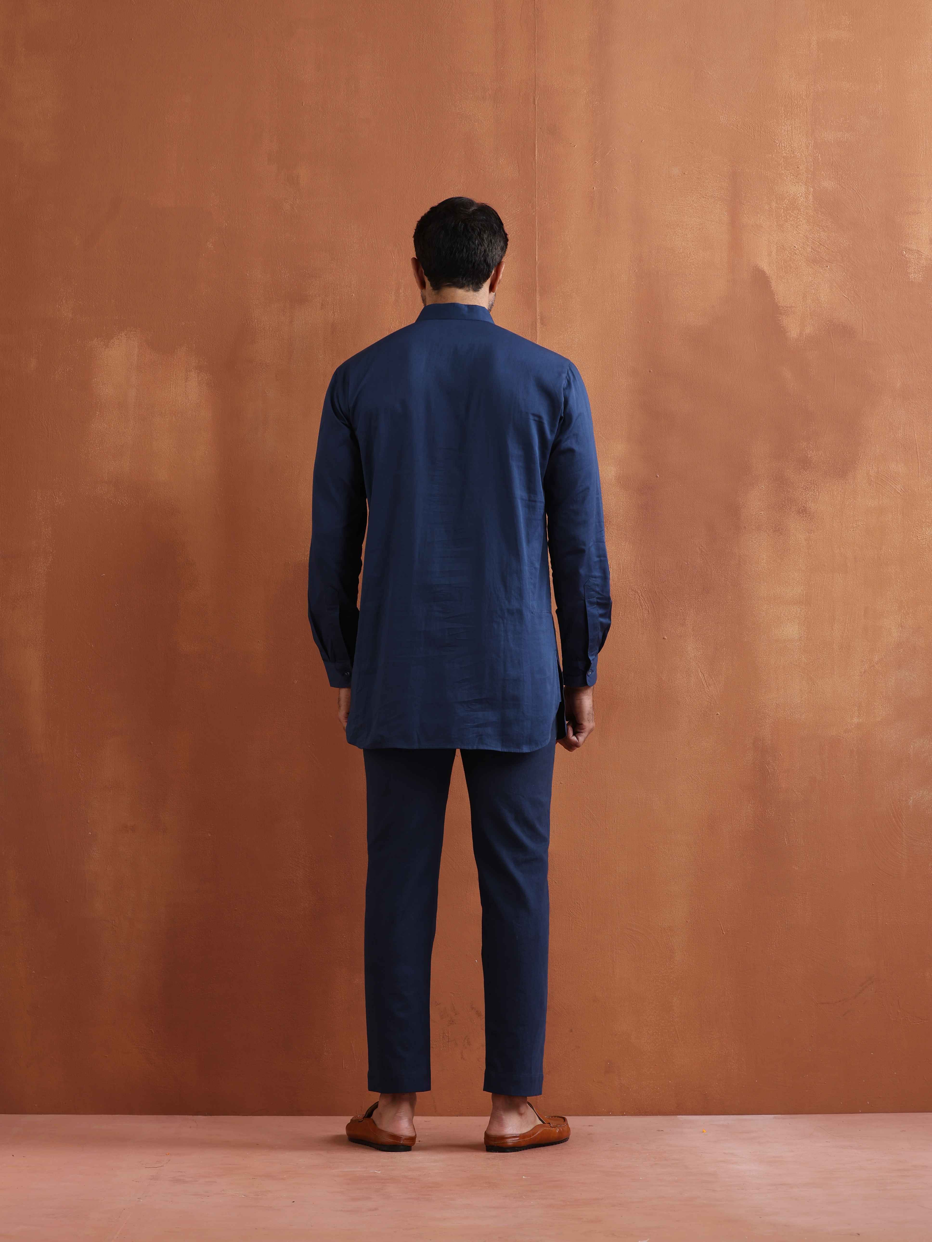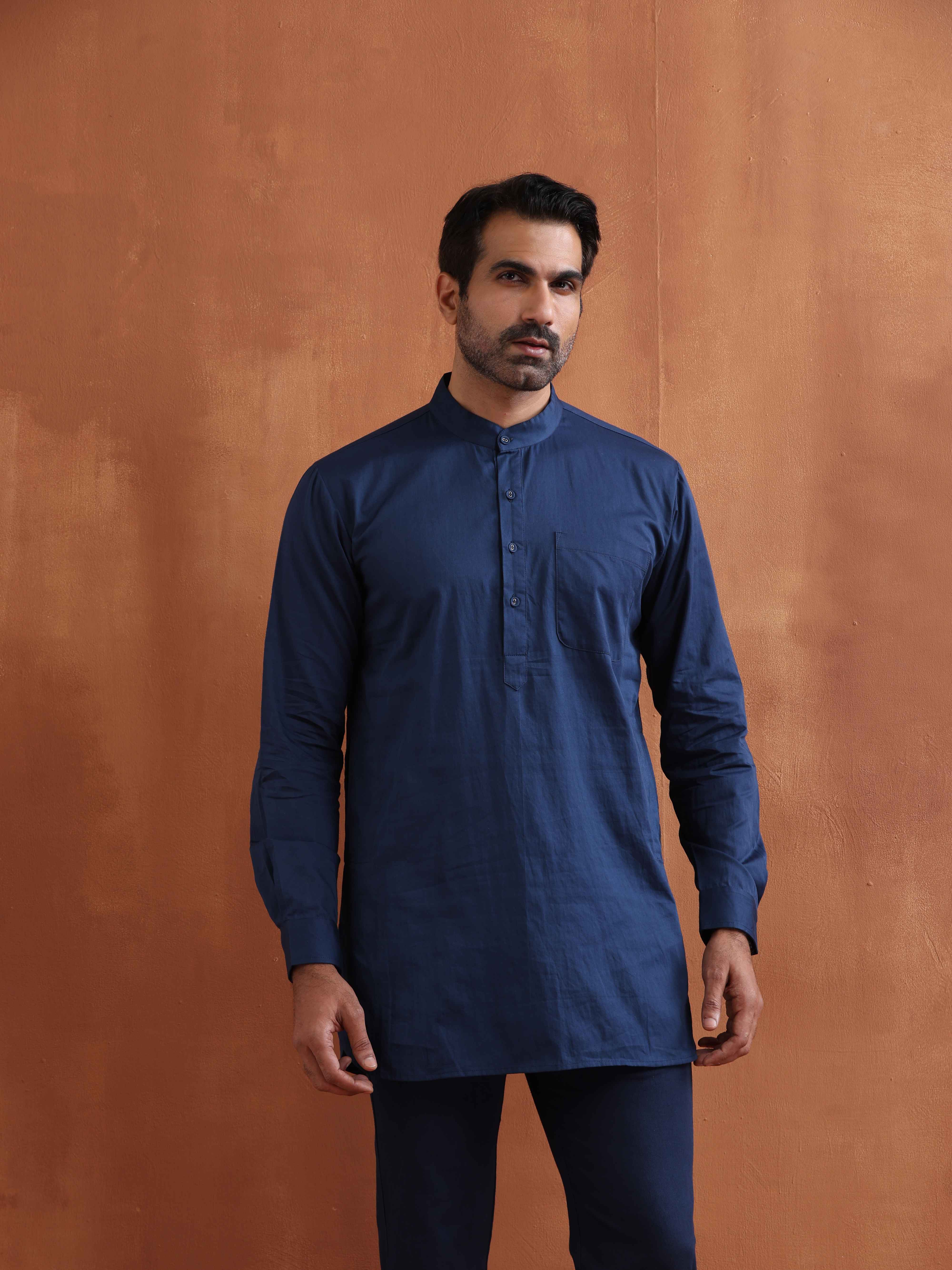 trueBrowns Men's Blue Cotton Short KurtaDescription Upgrade your festive wardrobe with this blue cotton short kurta. Perfect for any occasion, it c...