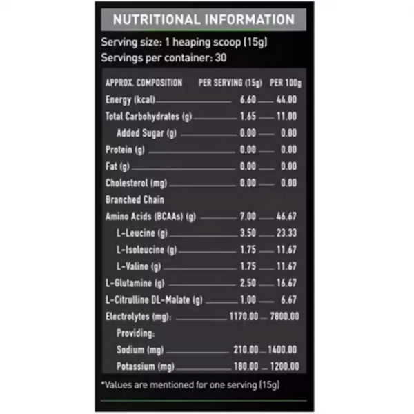 Branched Chain Amino Acids Powder L-Leucine, L-Isoleucine & L-Valine), L-Glutamine, Orange Fruit Powder, L-Citrulline DL-Malate 2:1), Trisodium Citrate Anhydrous, Natural Flavouring Substance, Acidity Regulator (INS 330), Potassium Chloride, Nature Identical Flavouring Substance, Natural Food Colours [INS 162 and INS 150d), Sodium Chloride & Sweetener (INS 955).