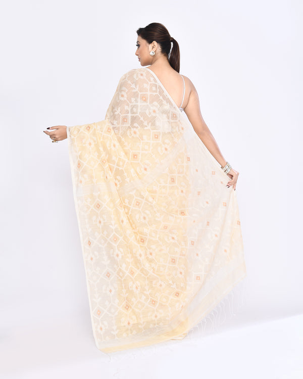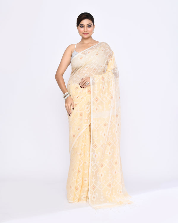 Piyari Fashion Women's Cream Embellished Cotton Blend Jamdani Saree - Free Size
