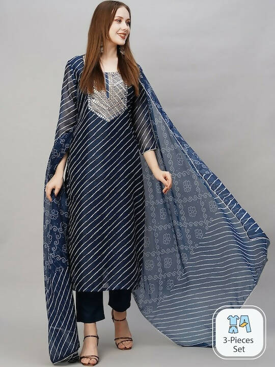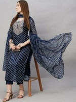 Indian Clothing Kalini Bandhani Printed Regular Kurta with Trousers & Dupatta Product Details Navy blue printed Kurta with Trousers with dupat...
