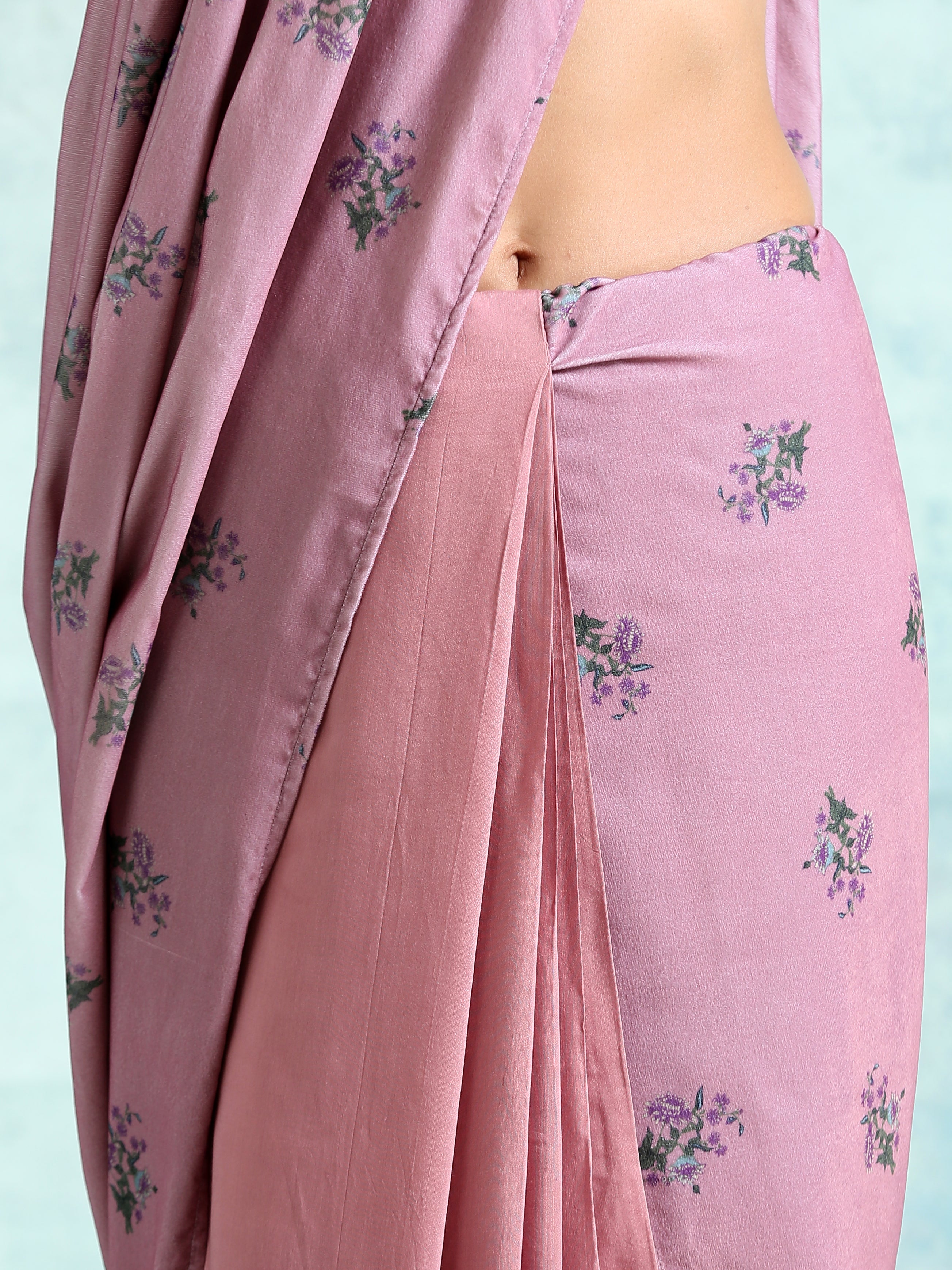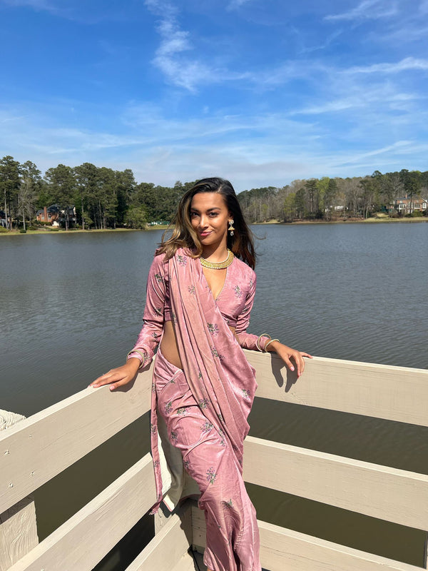 trueBrowns Light Mauve Printed Velvet Ready to Wear Saree - Freesize