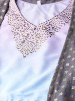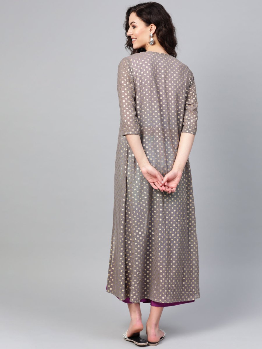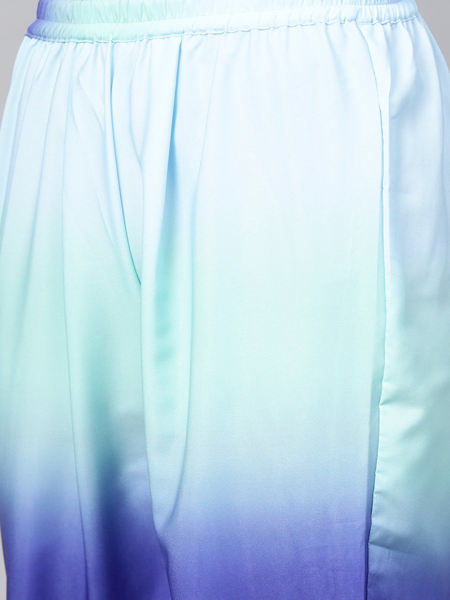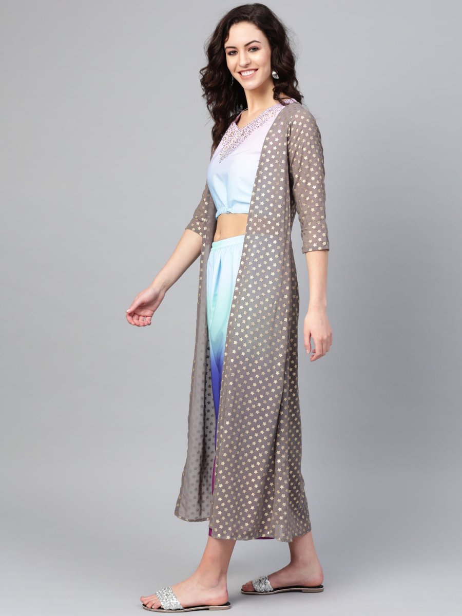 This is a perfect Indo western pick. The combo comprises culottes, an adjustable crop top with a translucent jacket. The whole outfit is printed. The ombre shaded effect is the highlight. Style with your silver/gold flats.
