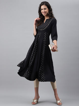 Janasya Women's Black Crepe Foil Printed Festive Anarkali Kurta Color: Black Fabric: Crepe Work/Pattern: Foil Printed Occasion: Festive Style: Anarkali Sleeves Length: 3/4 Sleeves Sleeves type: Regular Sleeves Neck Type: Mandarin Collar Length Type: Calf Length Length (Inch): 48 Sleeve length: 17 Fabric Care: Hand Wash Legal Disclaimer: Product color may slightly vary due to photographic lighting sources or your monitor settings.Product ID:12778421