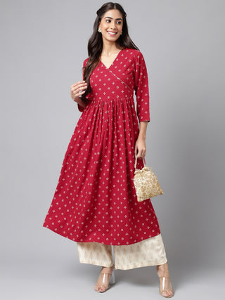 Janasya Women's Maroon Cotton Floral Printed Angrakha Western Dress - Distacart