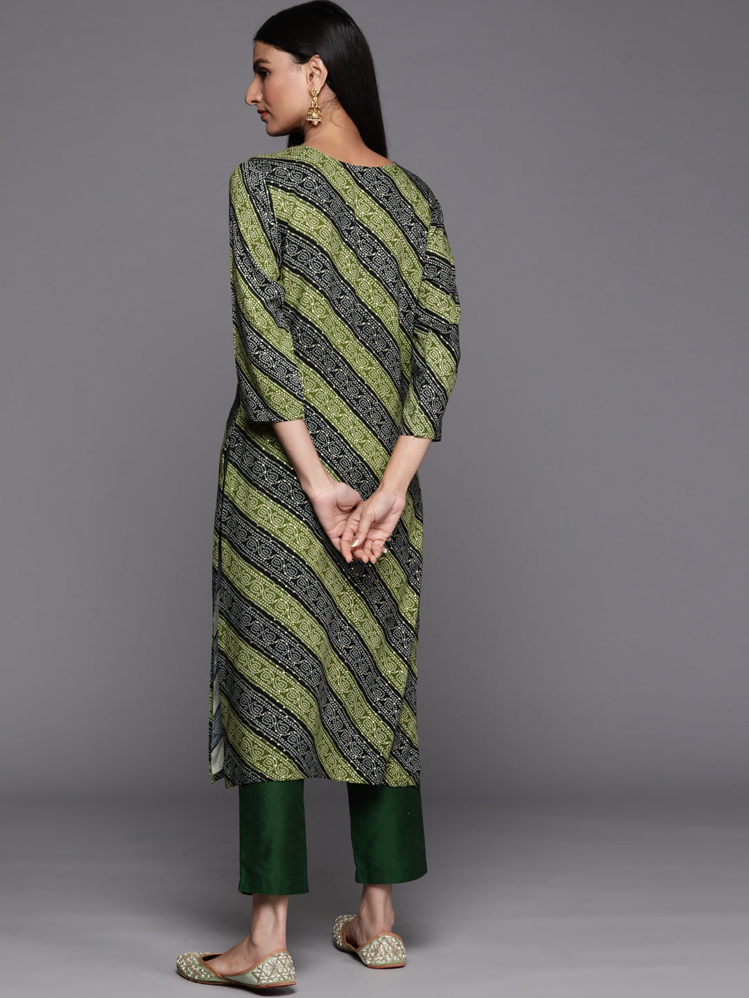 Green and black bandhani printed kurta with embroidered yoke, kurta has embroidered button detailing's, has round neck and three quarter sleeves.