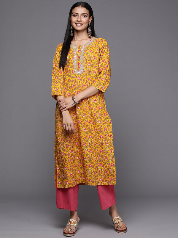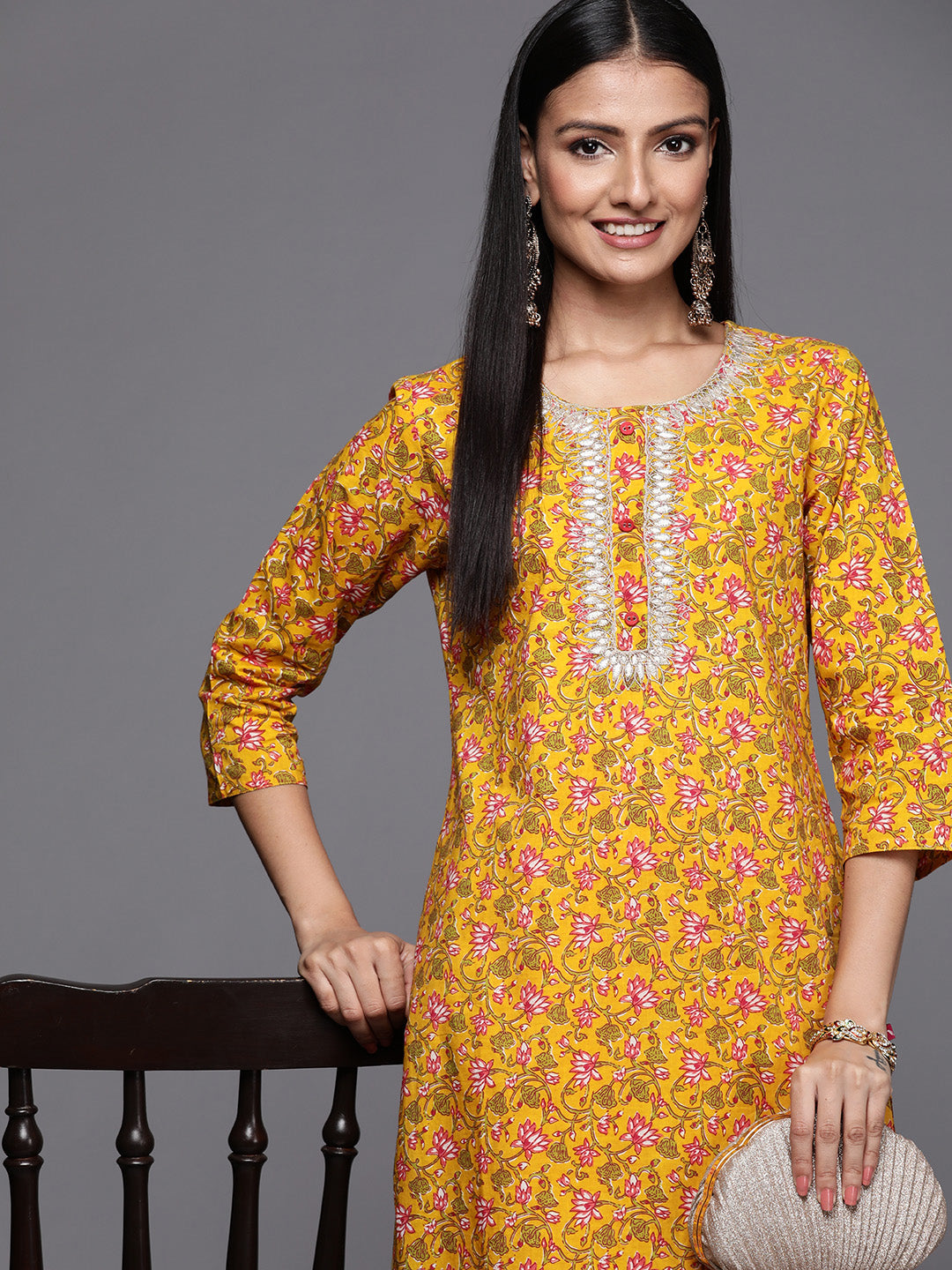 Mustard floral printed straight kurta with embroidered neckline, kurta has round neck and three quarter sleeves, has contrast button detailings on placket.