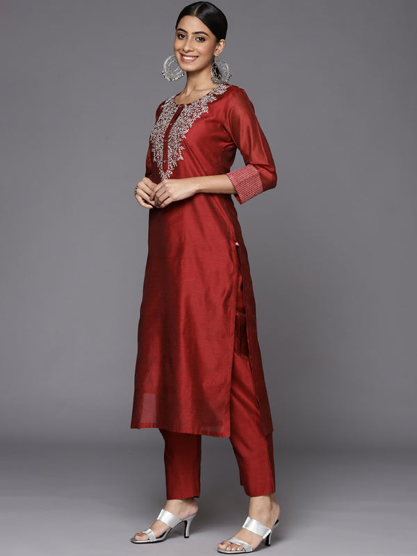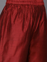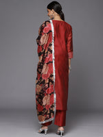 Red embroidered kurta with tonal trouser and multi colour printed fronged dupatta,kurta has round neck and three quarter sleeves
