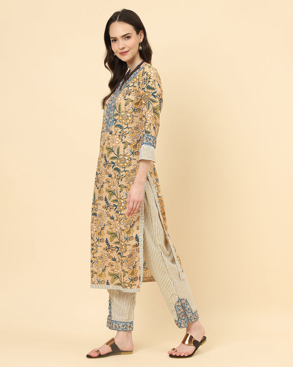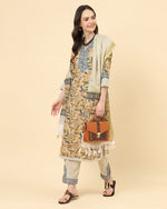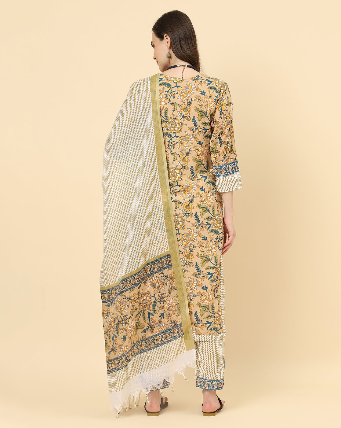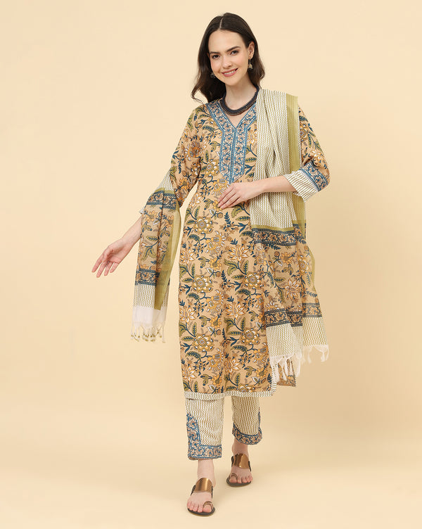 Varanga Women Gold Viscose Rayon Printed Regular Kurta With Trousers & Dupatta - S