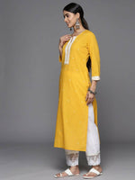 Varanga Women Mustard Kurta, Three Quarter Sleeves, Round Neck, Straight Kurta With Side SlitsAbout the product:Mustard Embroidred Kurta, Round Nec...