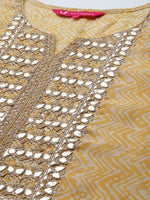 Varanga Women Mustard Yellow Printed Mirror Work Kurta with Trousers & DupattaDescription: Kurta design: Chevron printed Straight shape Regular...