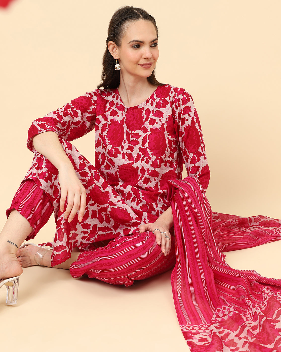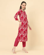 Varanga Women Red Viscose Rayon Printed Regular Kurta With Trousers & DupattaElegance And Honourable Come Together In This Beautiful Drape. Rea...