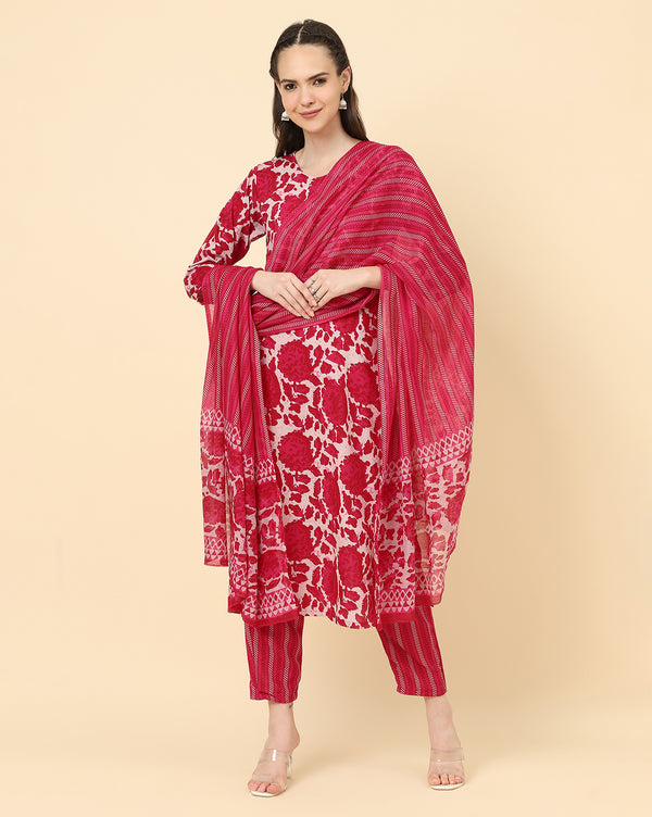 Varanga Women Red Viscose Rayon Printed Regular Kurta With Trousers & Dupatta