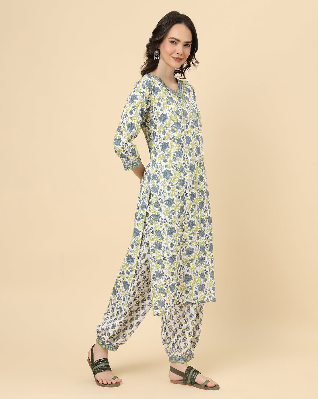 Varanga Women White Viscose Rayon Printed Regular Kurta With Trousers & Dupatta - S
