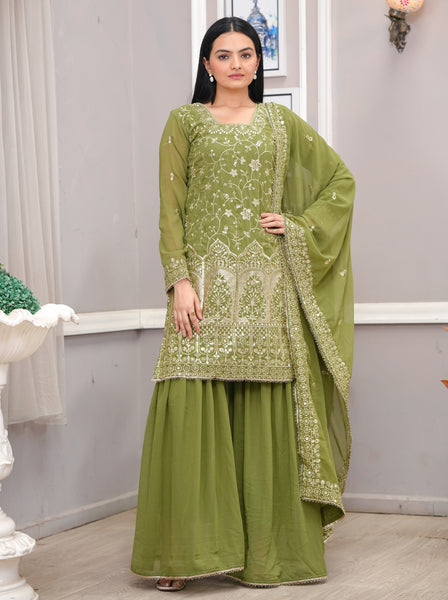 Lehenga Mart Mahendi Georgette Gorgeous Sharara Suit For Wedding WearProduct DetailsTopFabric: Fox GeorgetteInner: MicroWork: Sequence Embroidery W...