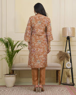 Rust tissue shimmerdigital printed straight kurti with gota embroidery on yoke paired withopada silk pants and embroidered schiffon dupatta