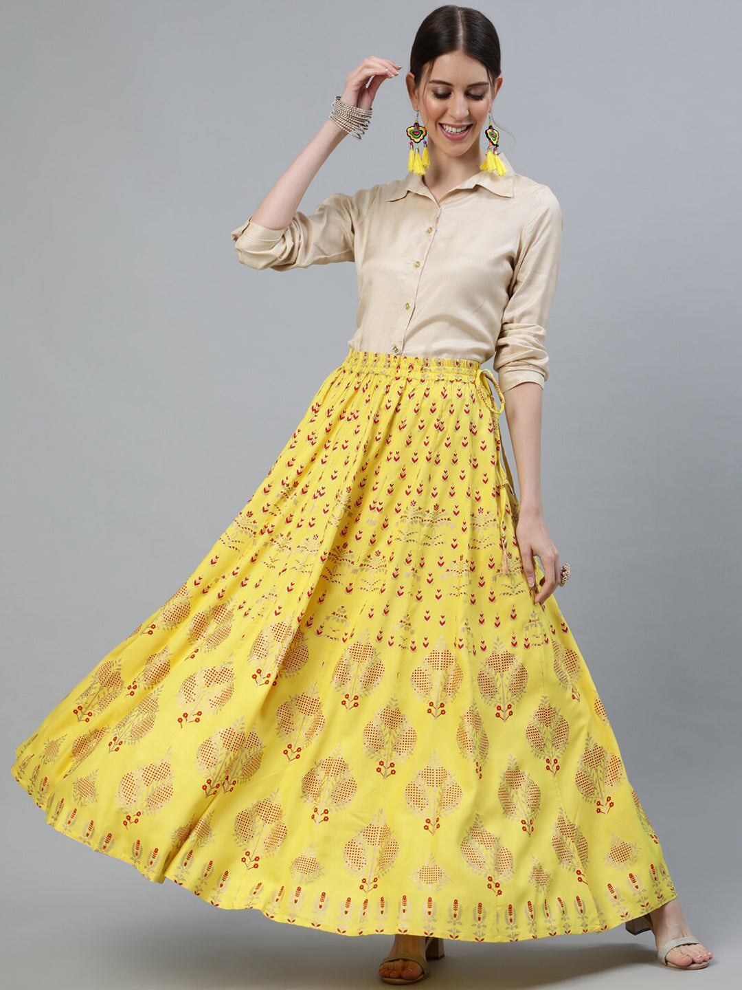 Jaipur Kurti Yellow & Red Printed Flared Women Maxi Skirt Product Details Yellow, red and gold-coloured printed mid-rise flared maxi skirt ...