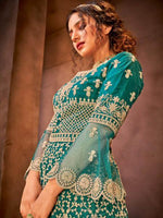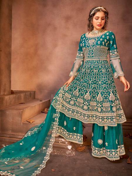 Rama Green Heavy Embroidered Gharara Suit features a butterfly net kameez, net bottom with net dupatta. embroidery is completed with Zari, Dori, and Stone. this Style is made in India and checked by hand to ensure high quality.