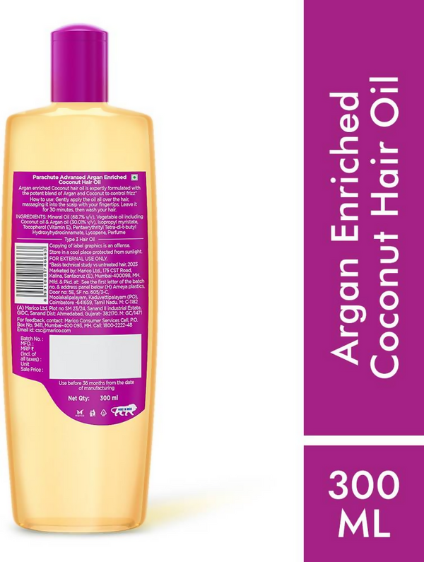 Parachute Advansed Argan-enriched Coconut Hair Oil. Thoughtfully formulated with a blend of superfoods- coconut and argan, it defies frizz, fixes flyaways, and effortlessly detangles your hair while adding a soft sheen to it. It is the best argan hair oil with a powerful formula that goes deep into the strands to repair dry, dull, and coarse hair.