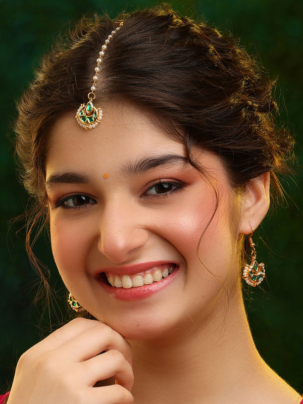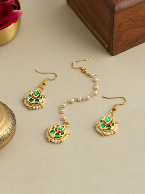 Ruby Raang Gold Green Kundan Earrings And Maang Tikka