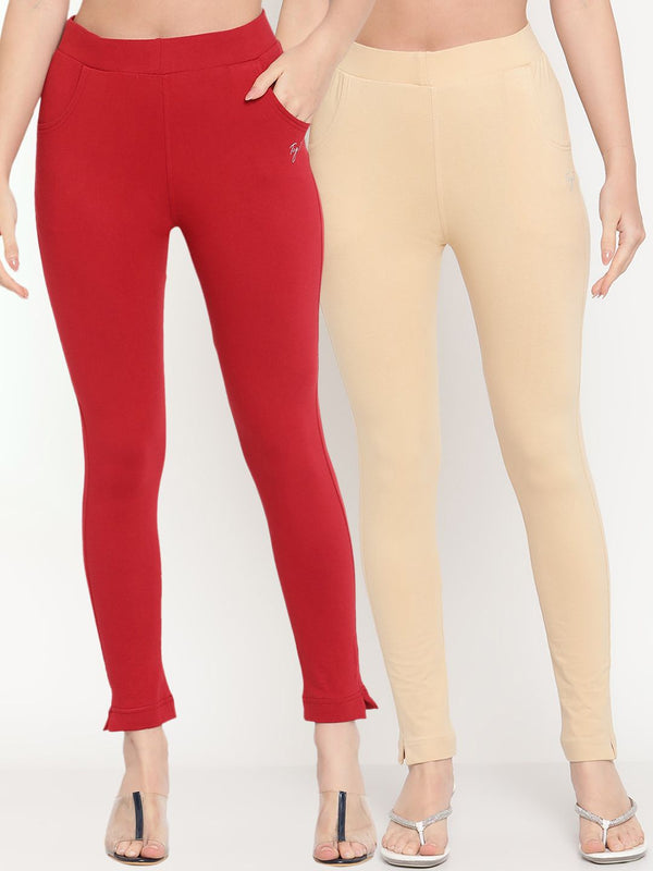 Solid mid rise leggings in beige & red with fully elasticated waistband, slip on closure, 2 pockets