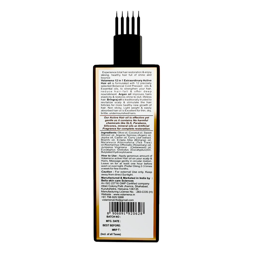 • Volamena 12 in 1 Extraordinary Active Hair Oil is formulated with 12 precisely selected botanical cold-pressed oils and essential oils to strengthen your hair, reduce hair fall and offer deep nourishment. Argan oil improves hair elasticity and restores shine to dull, lifeless hair. Bringraj oil is traditionally trusted to revitalize the scalp and stimulate hair follicles for more healthy new growth of hair. This non-sticky, lightweight and easily absorbed hair oil is excellent for thin, dry, brittle and undernourished hair.