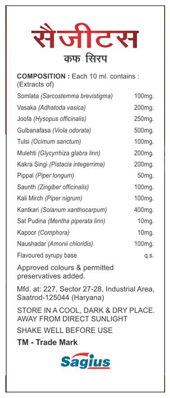 Sagius Sagituss Cough SyrupDirections For Use: Adults: Take 2-3 teaspoons thrice a day or as directed by your Health Expert Legal Disclaimer: State...