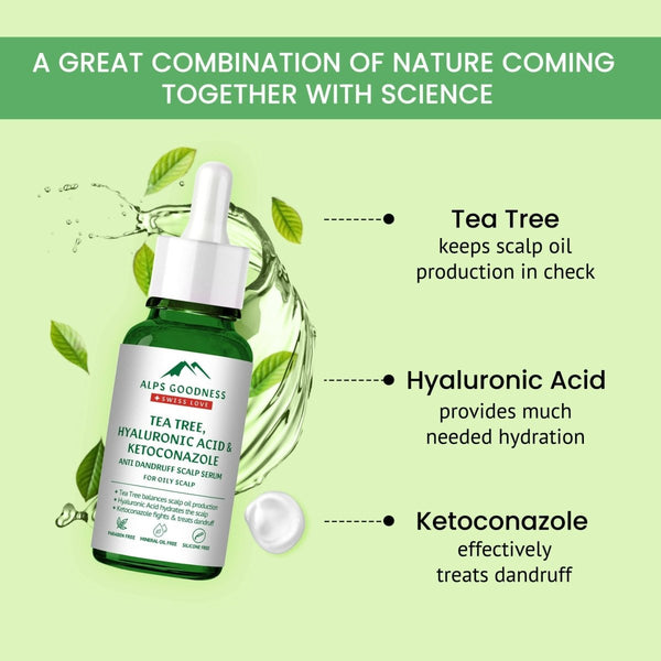 Trust Alps Goodness Tea Tree, Hyaluronic Acid & Ketoconazole Anti Dandruff Scalp Serum for Oily Scalp to get to the root of the problem. As the Tea Tree soaks up excess oil and unclogs pores it allows your scalp to breathe free. Add a dash of Hyaluronic Acid, which your thirsty scalp will drink right up, frizz while at it. Lightweight and choked with super clean ingredients this serum does not leave any unwanted residue behind, only a nourished and healthy scalp.
