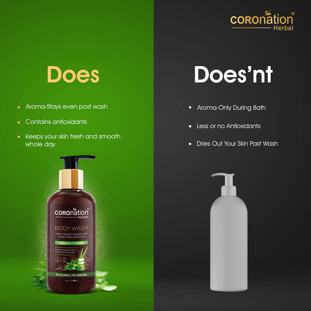 COROnation Herbal Aloe vera and Neem Body Wash has the goodness of natural skin-loving bio-active ingredients which remove impurities, toxins, and germs for a visibly refreshed, glowing skin every time you shower. The rich lather with Neem has anti-bacterial properties which help in thoroughly detoxifying and restoring the skin's purity keeping the skin healthy without the dryness offered by soapy body cleansers.