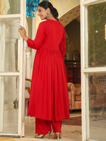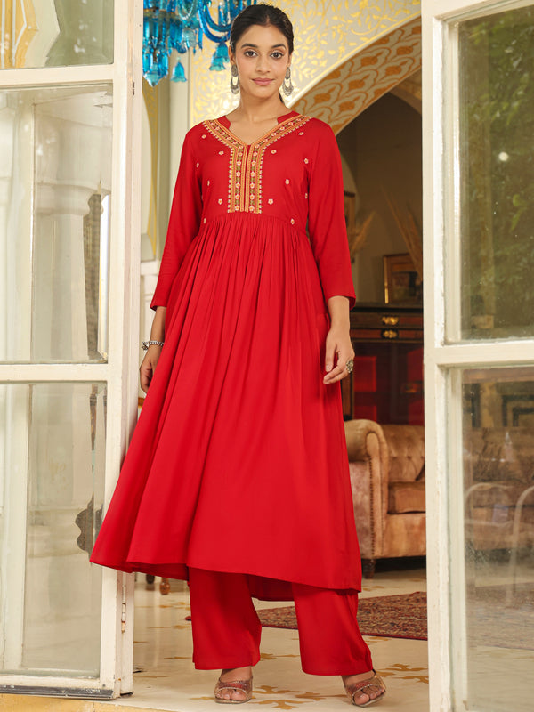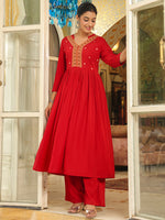 Janasya Maroon Rayon Embroidered Kurta & Bottom