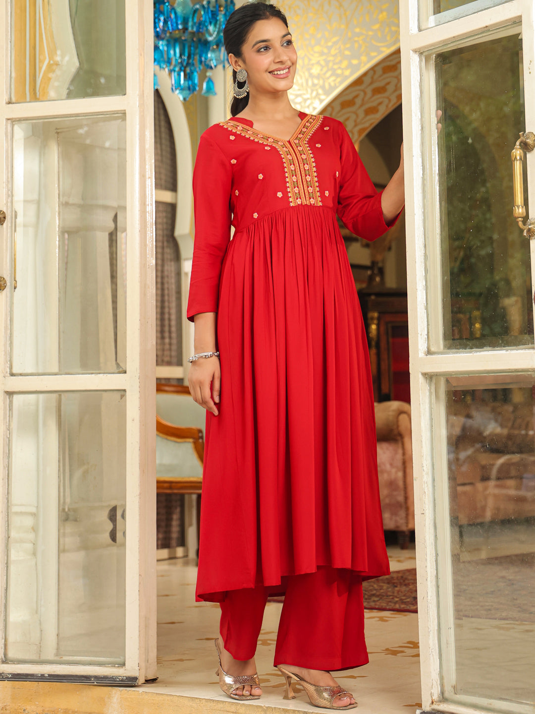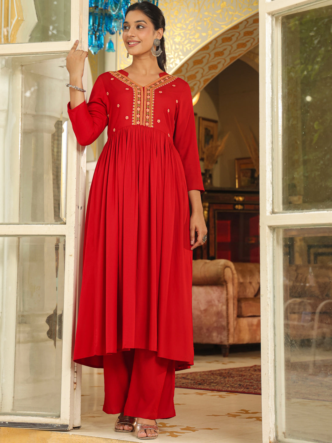 Janasya Maroon Rayon Embroidered Kurta & Bottom - Distacart
