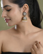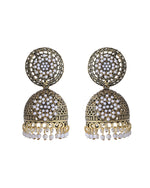 These Gold Toned Stone Studded Dome Shaped Jhumka Earrings with Pearls exude a perfect blend of tradition and elegance. Featuring a dome-shaped design adorned with sparkling stones and delicate pearls, they add a luxurious touch to your look. Ideal for weddings, festive occasions, or special events, these jhumkas bring timeless beauty and sophistication to any outfit.
