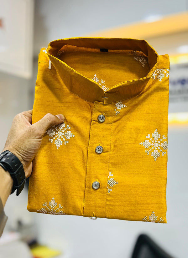 Prazu Fashion Yellow Silk Copper Sequence Work KurtaAbout the Product: GENDER : male Colour : Yellow Work/Pattern : Sequence Fabric : Silk Neck Lin...
