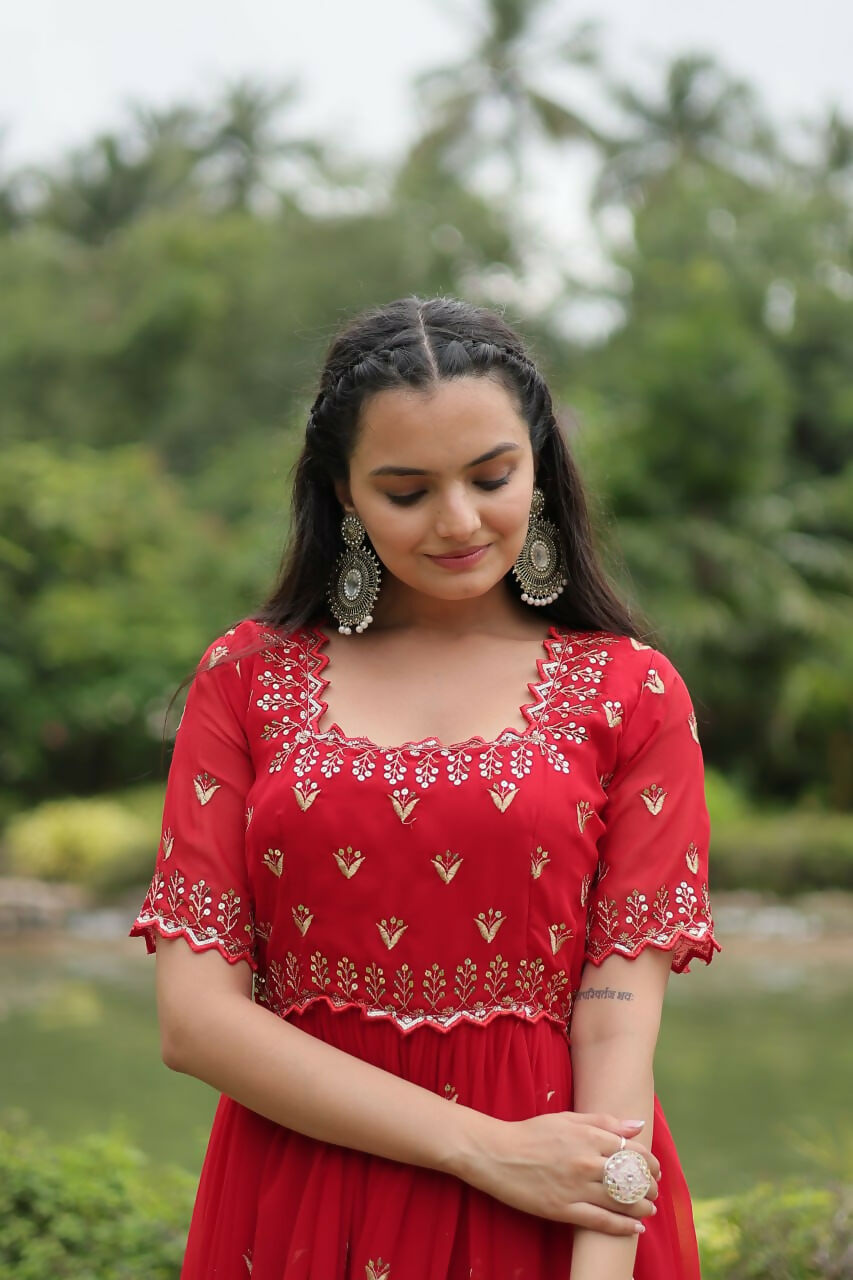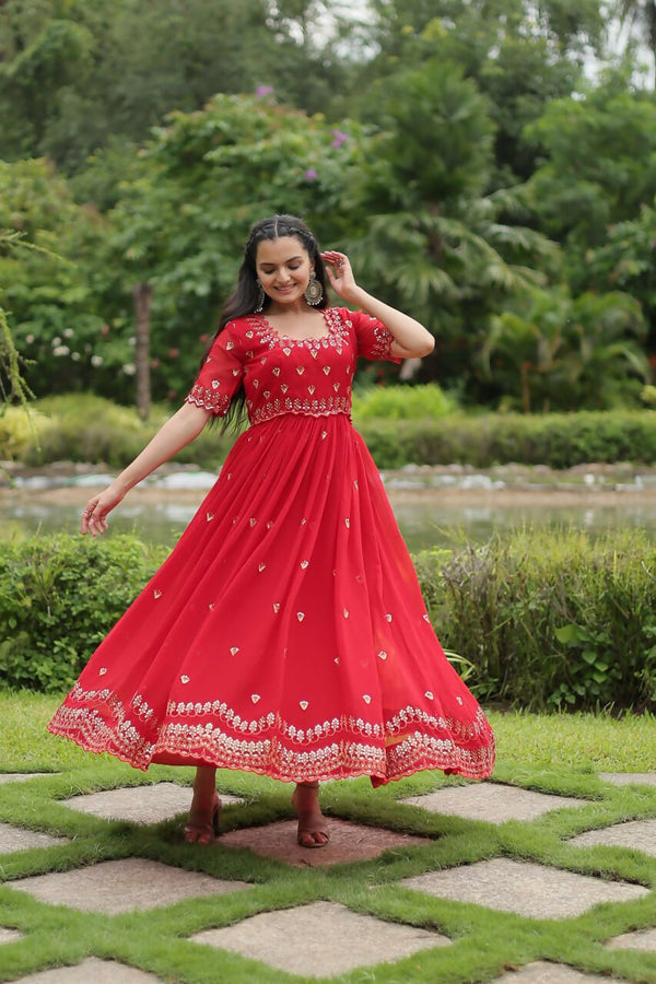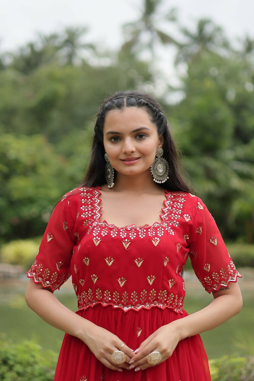 Vastranavya Premium Designer Faux Blooming with Embroidery Zari Sequins work Gown - Red