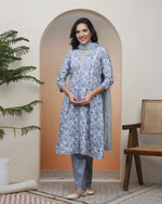Grey floral printed front panel jacket style kurta pang and solid schiffon dupatta set