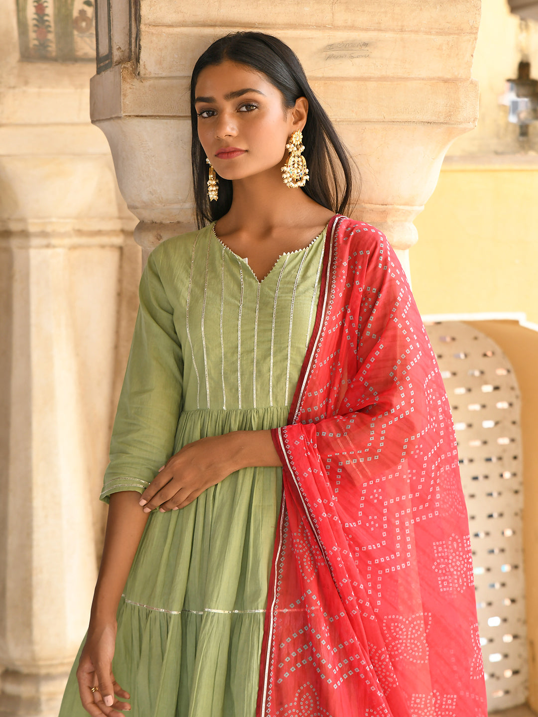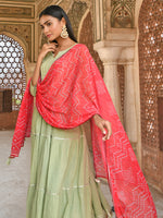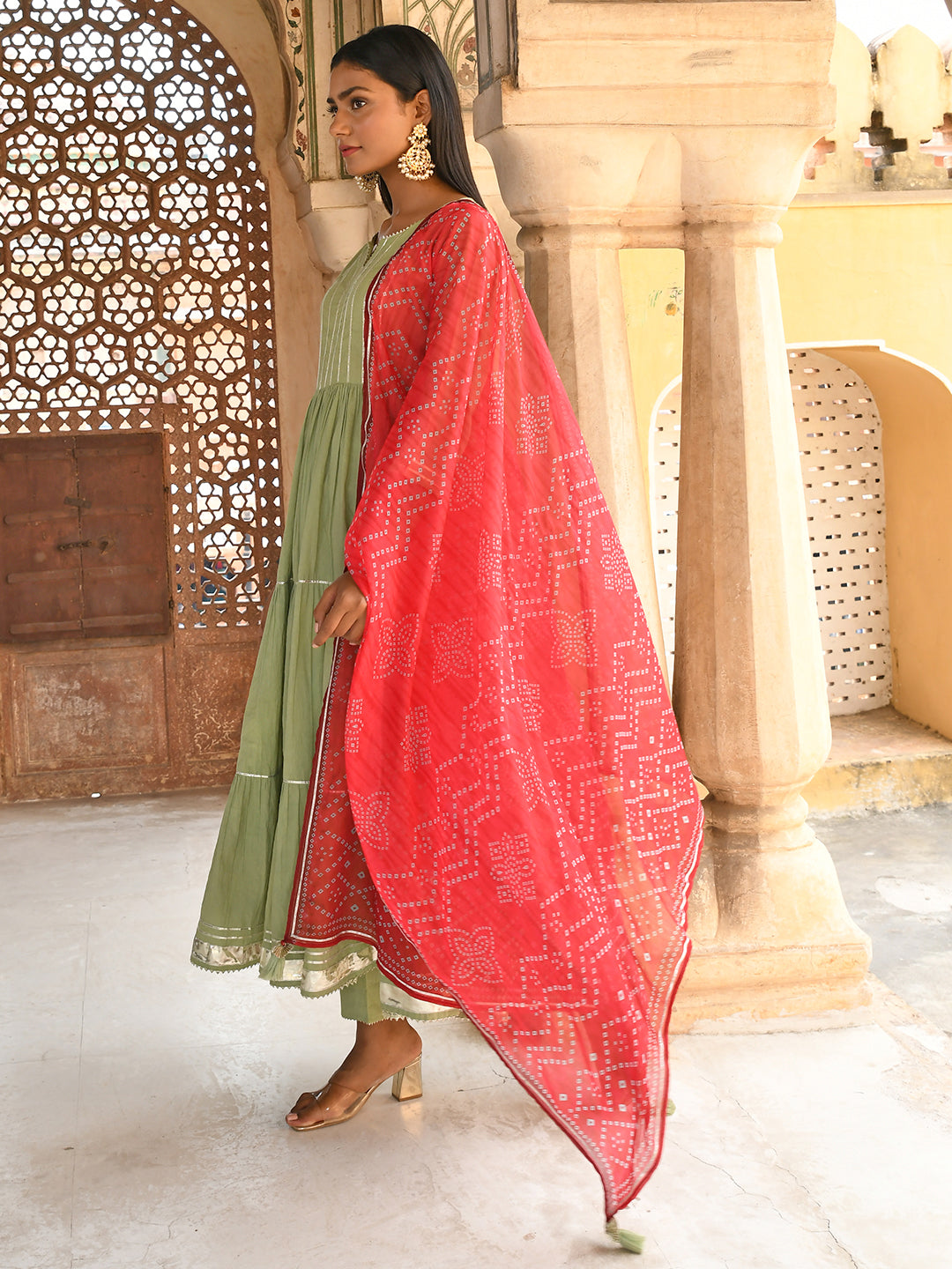 Liven up your regular day look with this pastel green flared cotton soild kurta and pant set with bandhani printed chiffon dupatta. The kurta comes with gota detailing, 3/4 sleeves, notch neck, with flared silhouette. It comes with pastel green solid cotton pants featuring elasticated waist, paired with red bandhani printed chiffon dupatta with gota detailing at the borders.