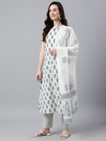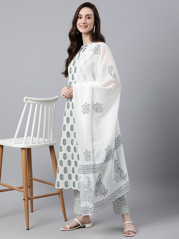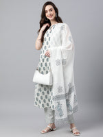 Janasya Women's White Cotton Floral Print Kurta With Pant And Dupatta - Distacart