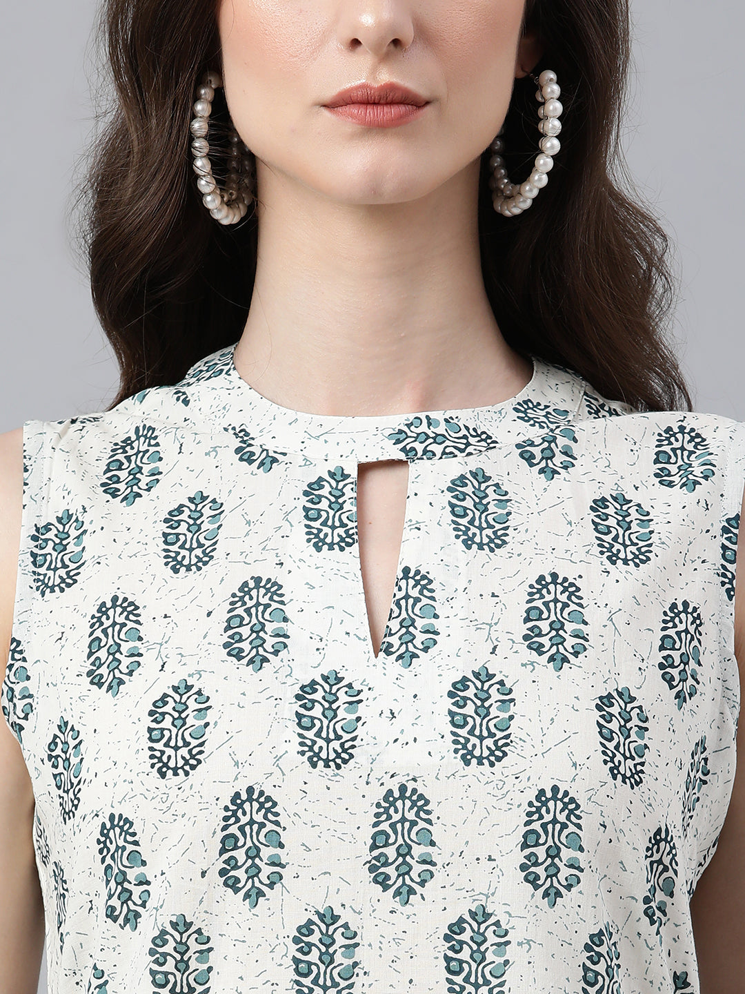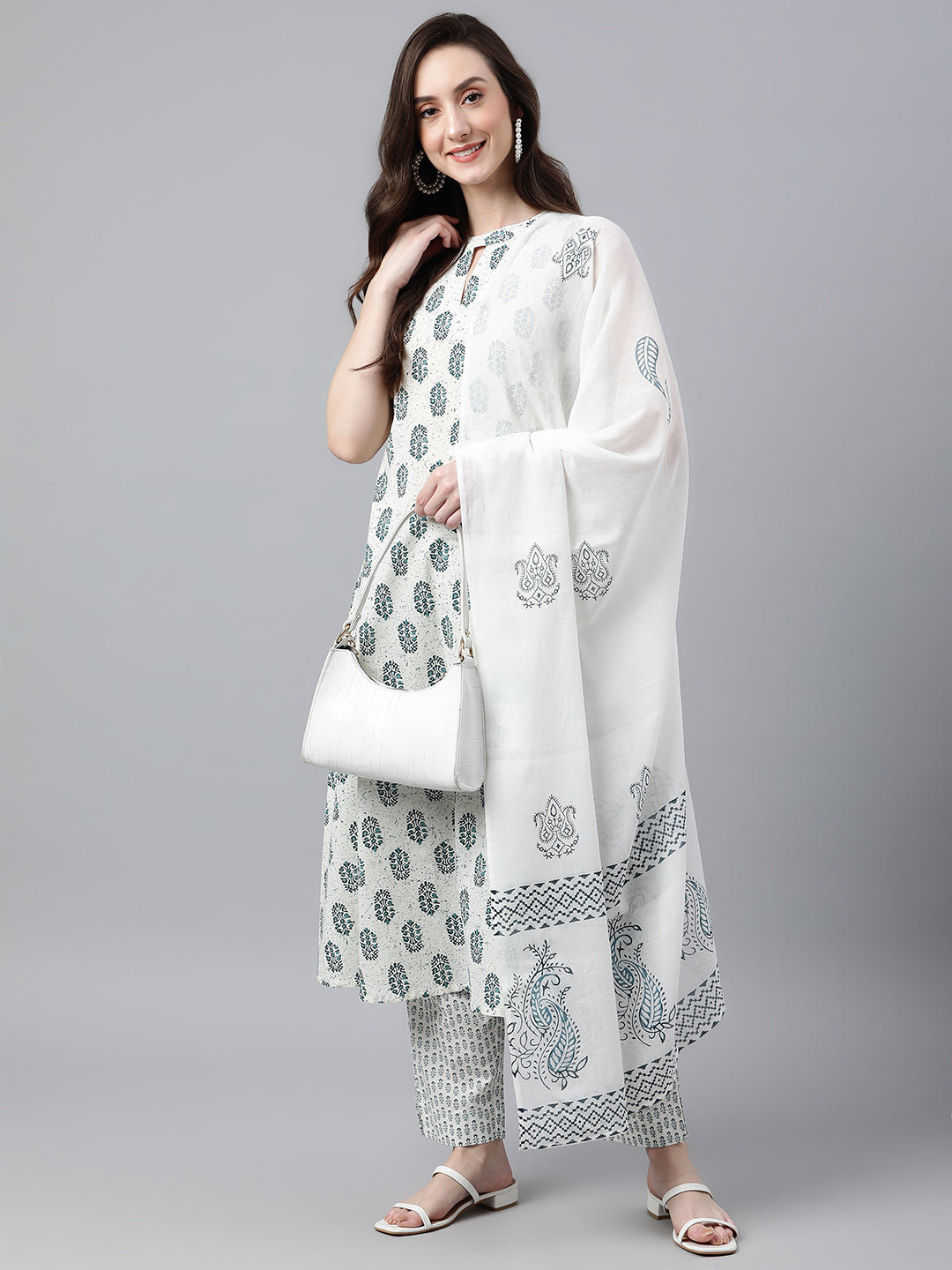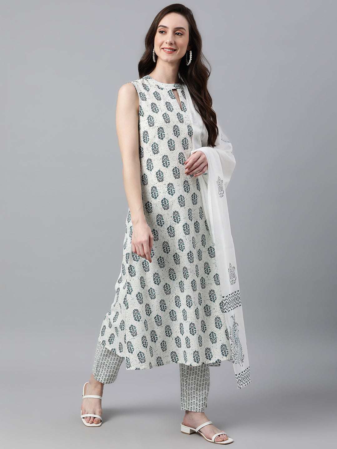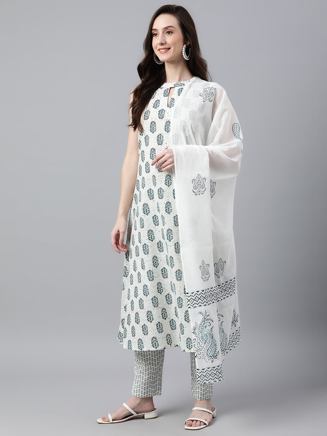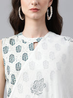 Bring your style game to perfection with this white printed cotton kurta pants set with cotton printed dupatta. The kurta features key hole neck, sleeveless with a line comfortable silhouette. The pants is crafted in comfortable cotton fabric and it is paired with white cotton printed dupatta.