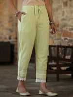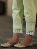 Juniper Women'S Lime Green Cambric Floral Print Kurta Sets With Round Neckline And Three Fourth Sleeve, Lace And Gotta Patti Detaling On Sleeve And Staright Pants, Sequin And Bead Work Detaling On Yoke, Calf Length, Casual Wear.