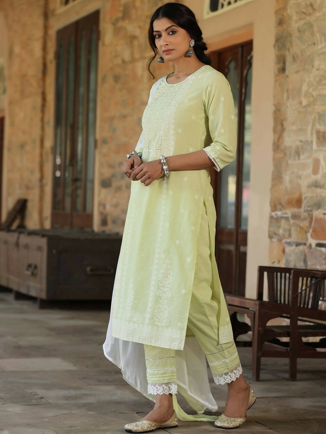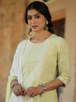 Juniper Women's Lime Green Cambric Floral Print Kurta Straight Pant And Duptta SetsJuniper Women'S Lime Green Cambric Floral Print Kurta Sets With ...