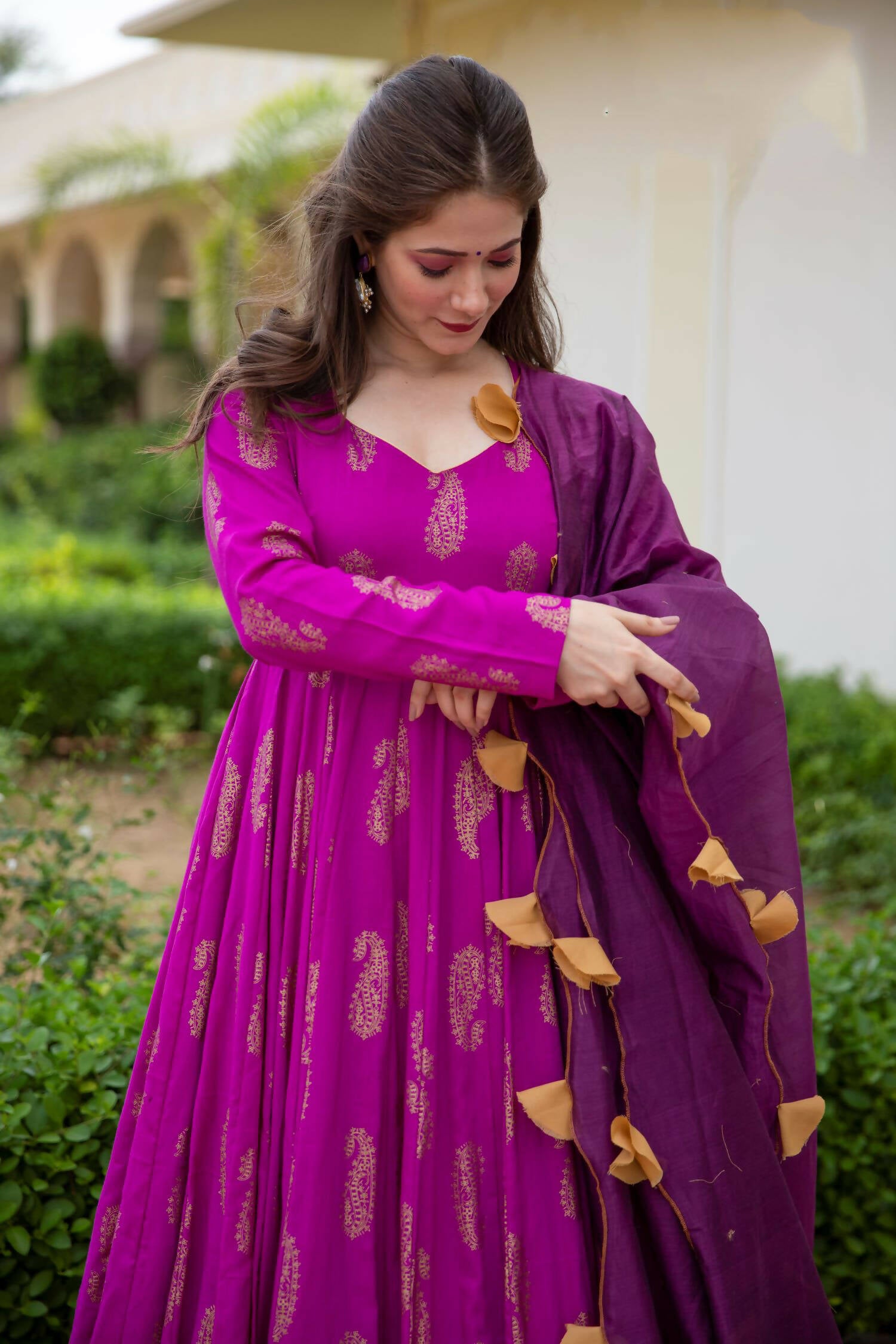 Purple Pure Reyon Gold Foil Work Stitched Suit With Dupatta - Anbazaar Color: Purple Material: Pure Reyon Work: Gold Foil Work Dupatta Color: P...