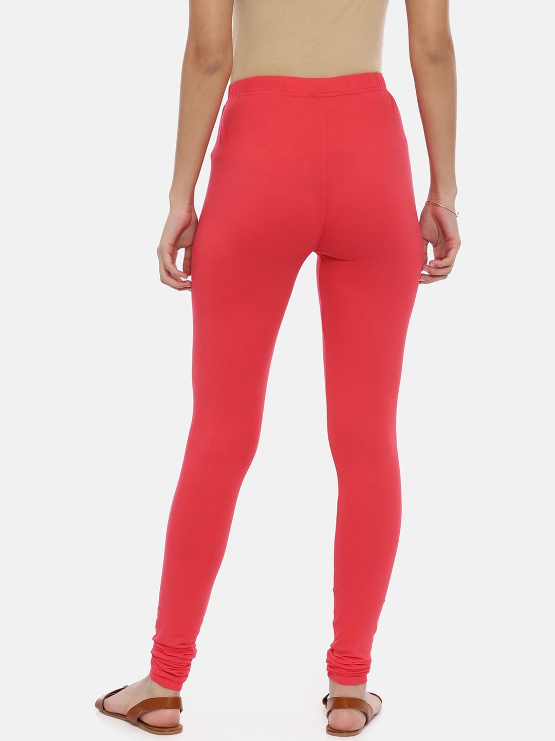 Red solid slim-fit churidar-length leggings has an elasticated waistband, and slip-on closure