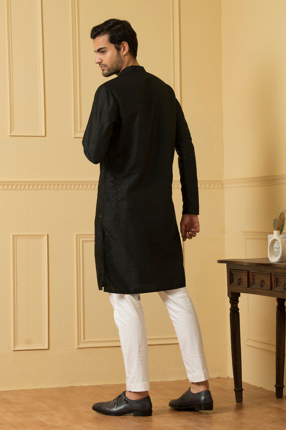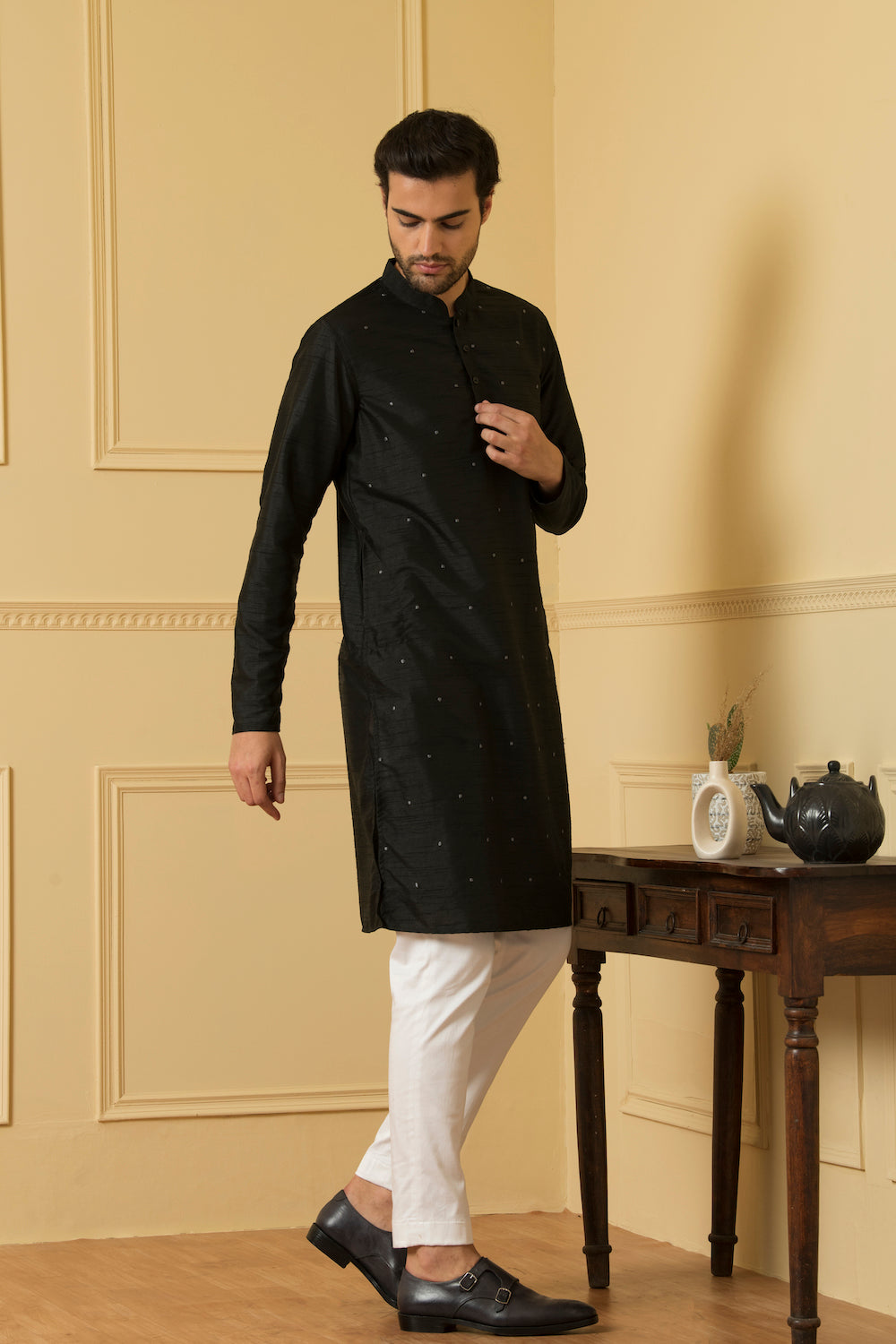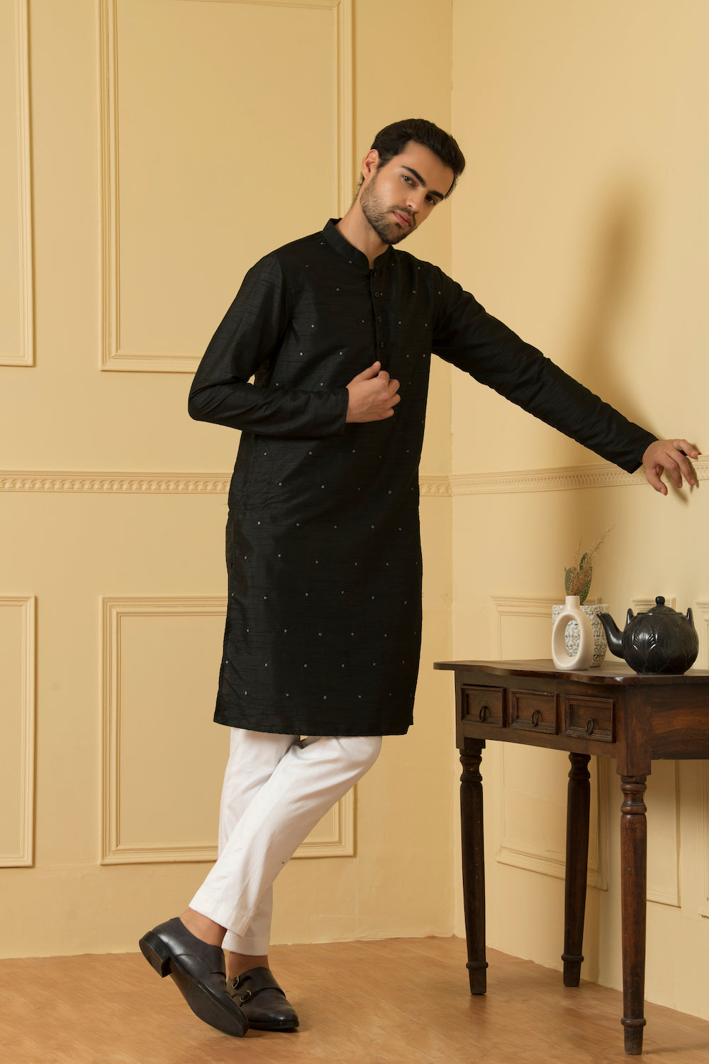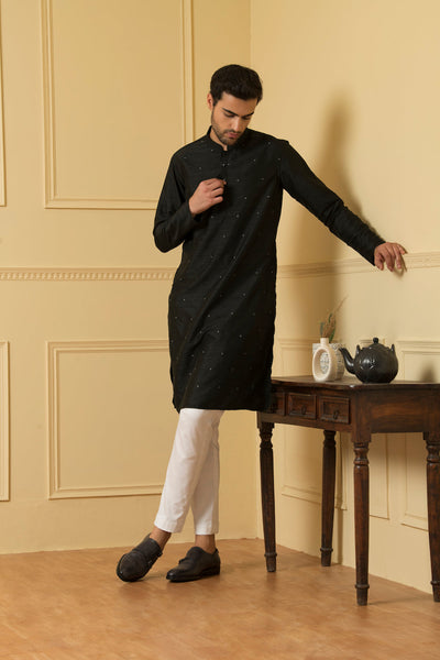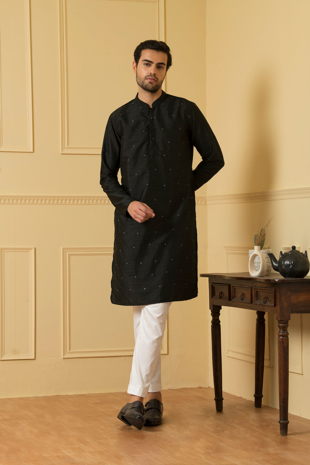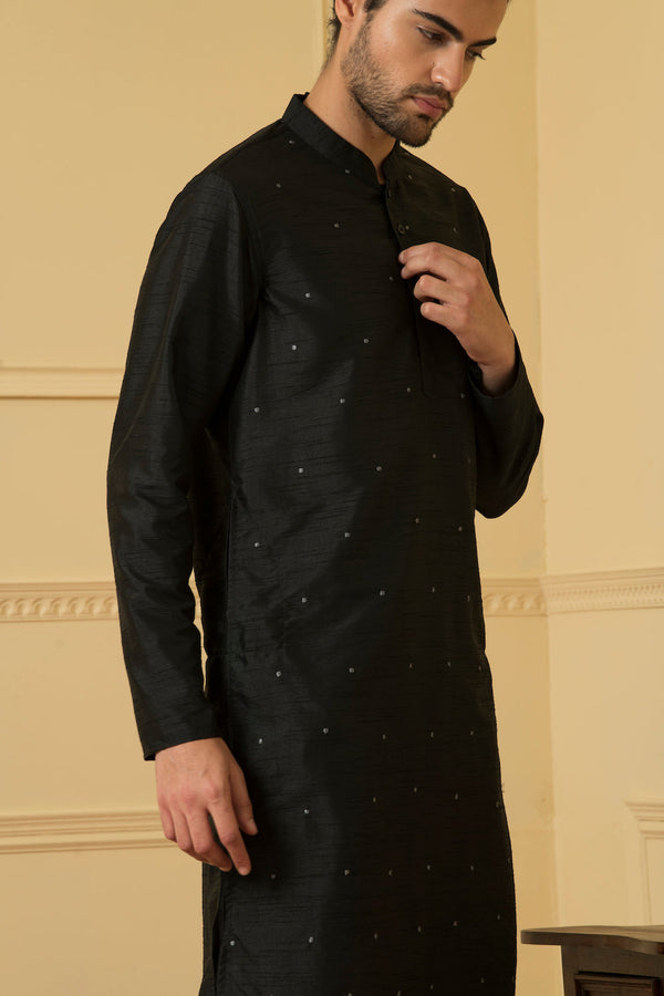 Semi Raw Silk Dotted Kurta this exquisite kurta is crafted from high-quality semi raw silk fabric, known for its luxurious texture and natural sheen. The delicate dotted pattern adds a touch of charm and playfulness to the design, making it a versatile choice for various