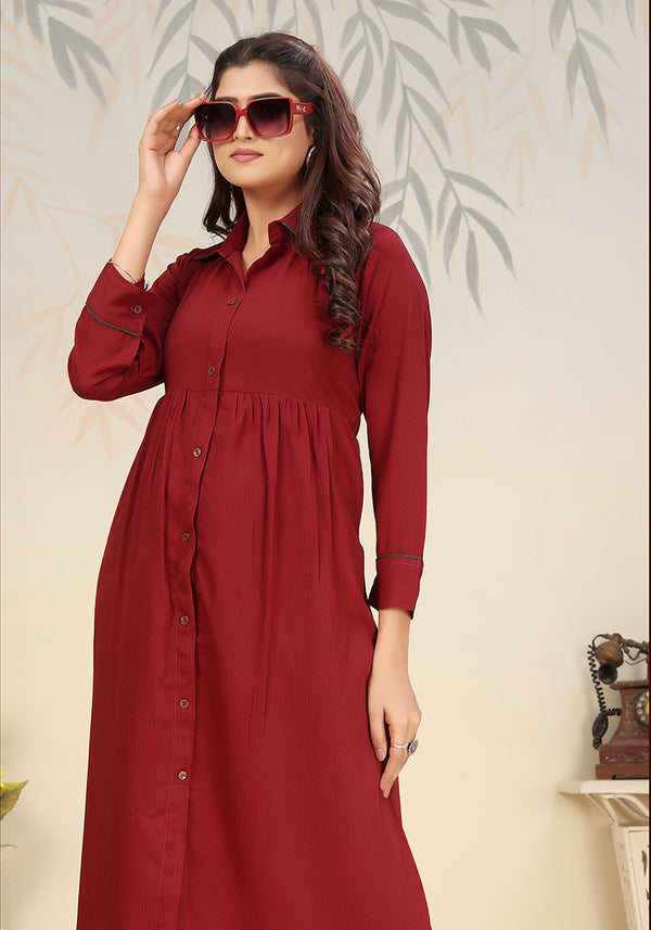 Monjolika Fashion Maroon Cotton Solid Festival Casual Kurti