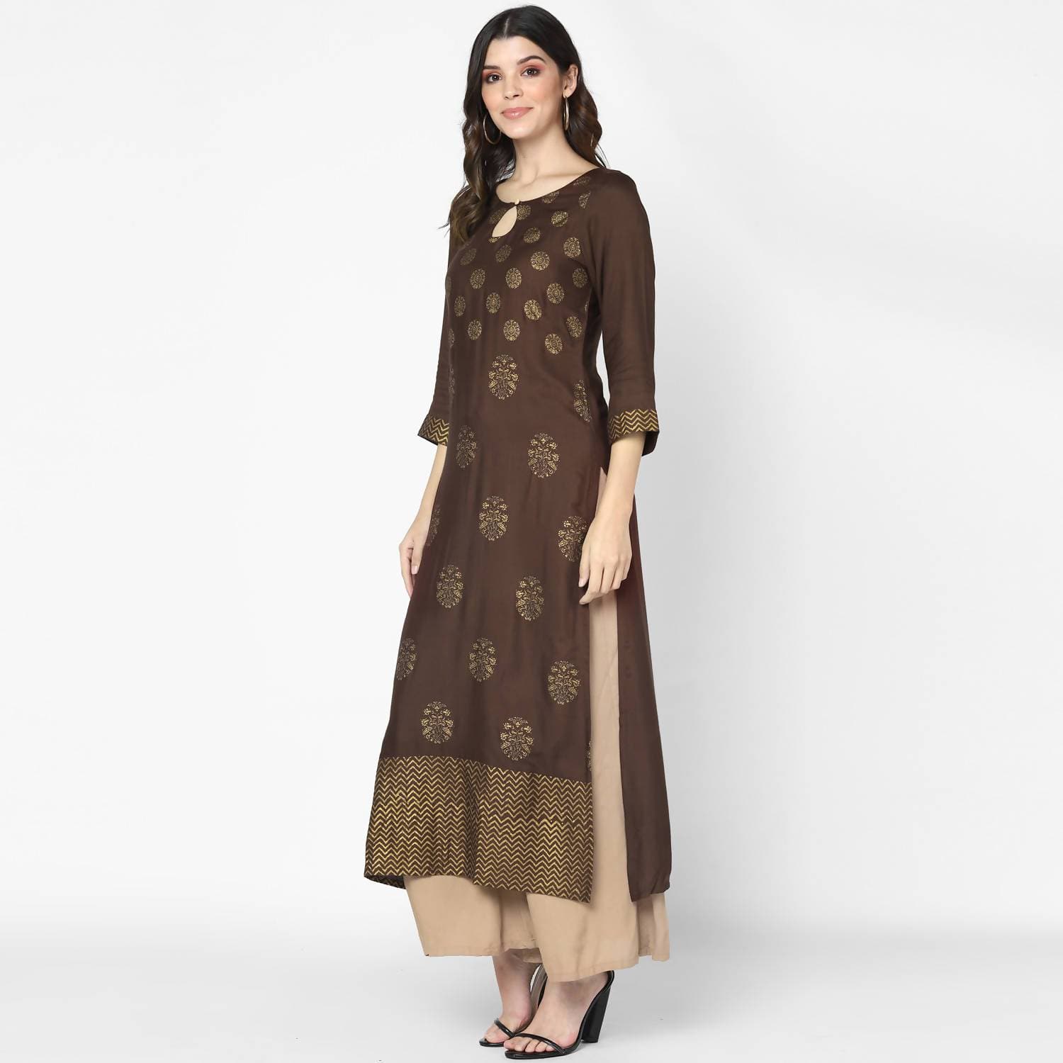 Cheera Hand Block Print Brown & Skin Color Straight Kurta With Palazzo (MAAI-081K):Cheera products are known for best quality and great custome...