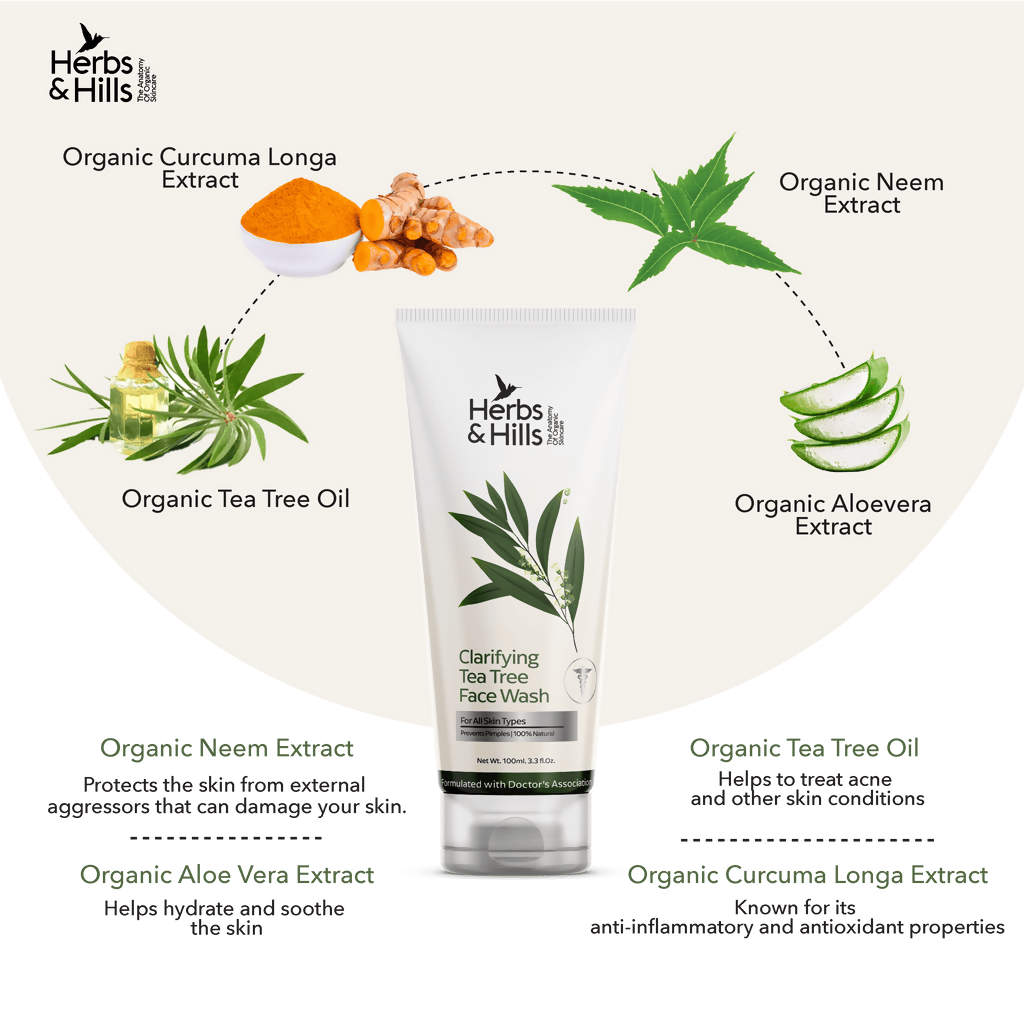 • Introducing Herbs & Hills Clarifying Tea Tree Face Wash - the cutting-edge solution for achieving clear, healthy-looking skin and removing and preventing acne. Enriched with the goodness of original Tea Tree Oil, Curcumin, Neem Extract, and Aloe Vera Extract, this natural face wash provides a deep and gentle cleanse to remove excess oil, dirt, and impurities from your pores and rejuvenate your skin. Its all-natural formula soothes and hydrates dry skin, leaving it feeling refreshed and revitalized.