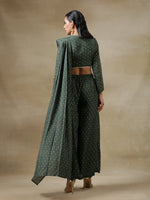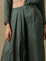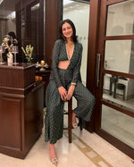 • Dark green single dot bandhani printed plazzo saree with stitched pleats and pleated drape stitched to the palazzo waist.