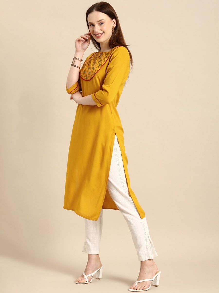 All About You Women Mustard Yellow Ethnic Motifs Yoke Design Keyhole Neck Straight Kurta Product Details Colour: mustard yellow Ethnic motifs y...