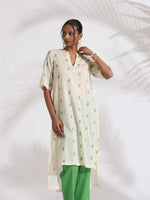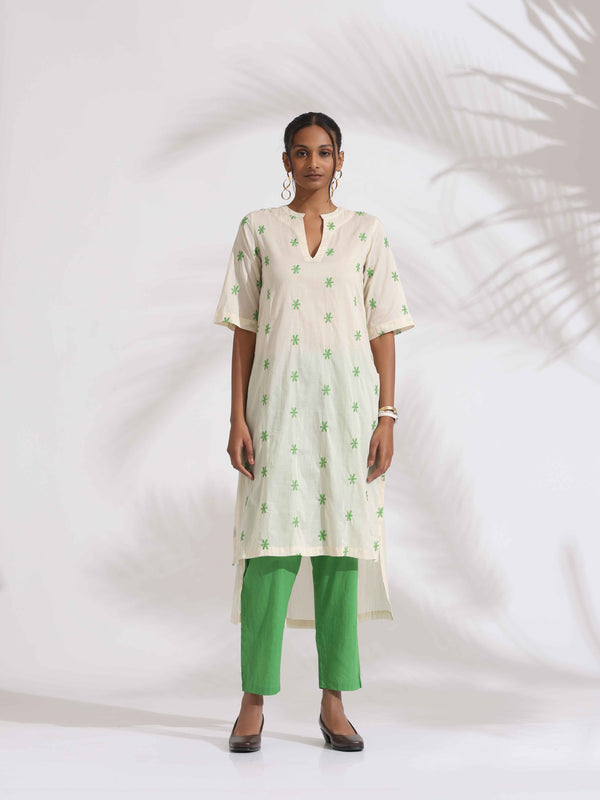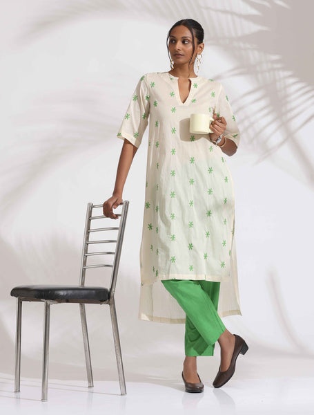 • Elevate your style with this Off-White cotton floral embroidered straight kurta with green cotton pants , it's an ideal blend of elegance and comfort.