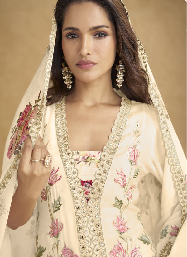 Vegaa Fashion Cream Floral Slit Style Designer Kurta Palazzo Suit