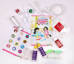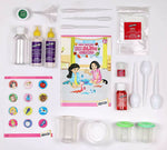 • Contents: 1 Manual, 1 Empty bottle, 3 Droppers, 3 Plastic spatulas, 1 Measuring beaker (Big), 1 Funnel, 1 Sticker sheet, 2 Slime containers, 2 PVA glue, 1 Borax (activator), 1 Plastic bowl, 1 Pink food color, 1 Glitter, 1 Tutti Fruity fragrance.